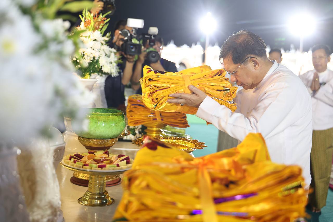 ယာယီသမ္မတက မာရဝိဇယဗုဒ္ဓရုပ်ပွားတော်မြတ်ကြီးအား ဖူးမြော်ကြည်ညို၍ မြသပိတ် ဆွမ်းတော်၊ သစ်သီးပန်းမန်၊ သောက်တော်ရေချမ်းနှင့် ဆီမီးများကပ်လှူပူဇော်ပြီး နေပြည်တော်ကောင်စီ အပါအဝင် တိုင်းဒေသကြီးနှင့် ပြည်နယ်ကိုယ်စားပြုရက်ကန်း အဖွဲ့(၁၅)ဖွဲ့မှ ရက်လုပ်စပ်ချုပ်သီလွှမ်းထားသည့် မသိုးရွှေကြာသင်္ကန်းတော် ၁၅ ထည်ကို ဆက်ကပ်လှူဒါန်းသည်။