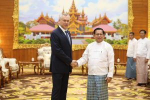 ယာယီသမ္မတ ဗိုလ်ချုပ်မှူးကြီးမင်းအောင်လှိုင် မာရဝိဇယဗုဒ္ဓရုပ်ပွားတော်မြတ်ကြီးအား မသိုးရွှေကြာသင်္ကန်း ဆက်ကပ်လှူဒါန်း
